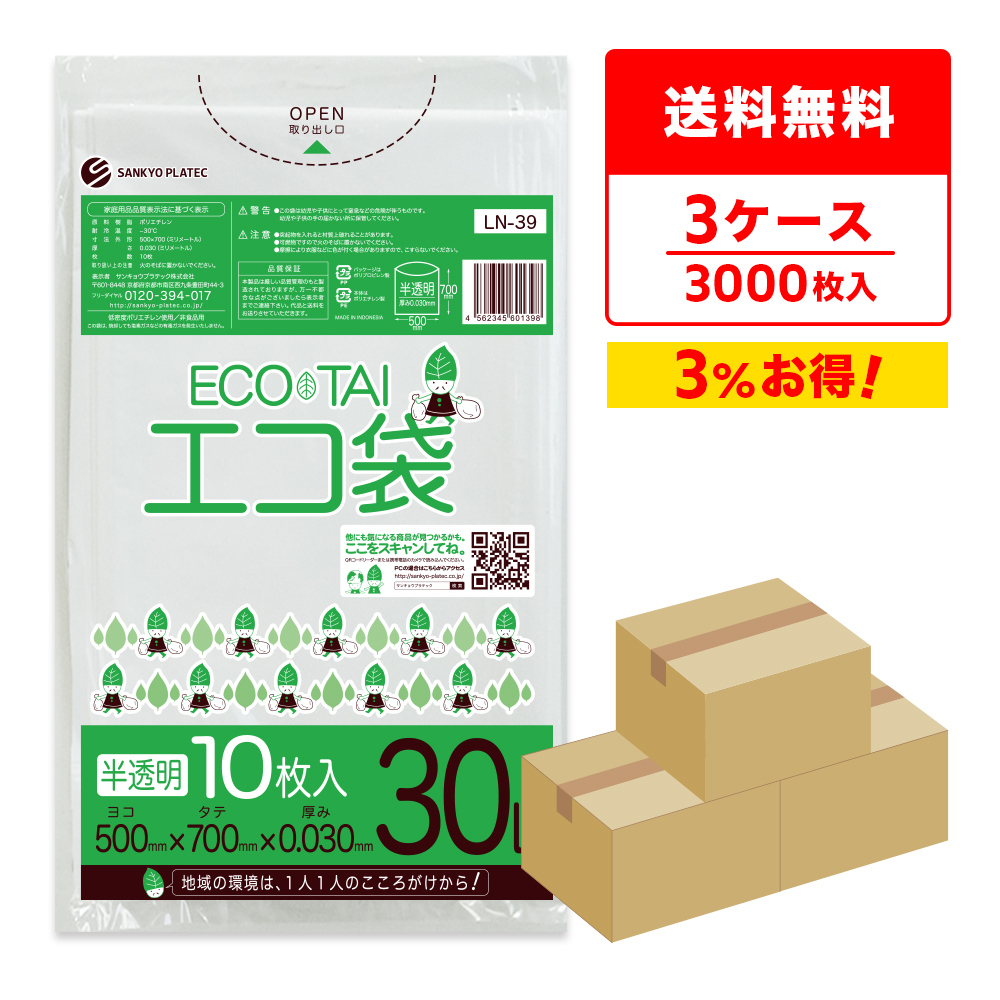 ゴミ袋 30L 半透明 50x70cm 0.030mm厚 10枚x100冊×3箱 LN-39-3 サンキョウプラテック