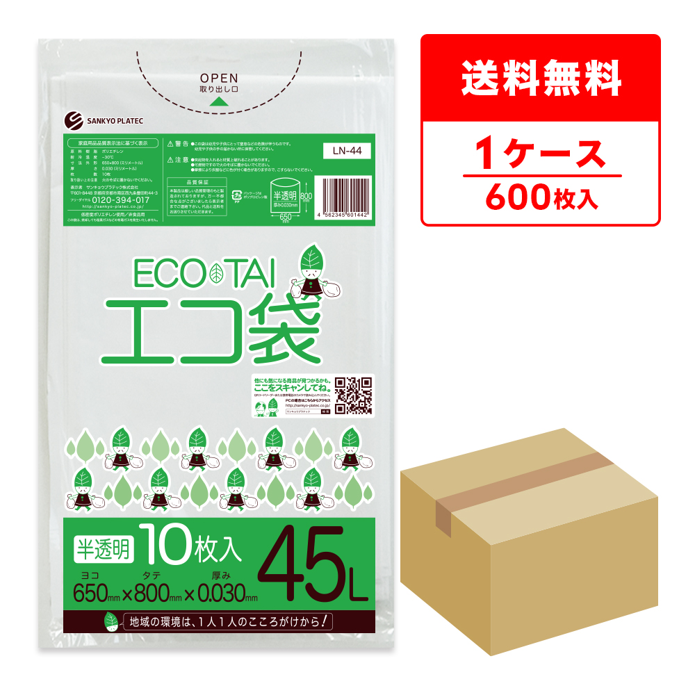 ゴミ袋 45L 半透明 65x80cm 0.030mm厚 10枚x60冊 LN-44 サンキョウプラテック