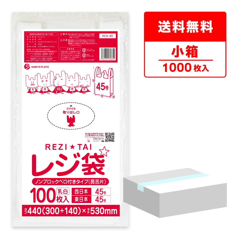 レジ袋 薄手 西日本 45号 (東日本45号) ブロック無 30x53cm マチ14cm 0.016mm厚 乳白 100枚x10冊 RCK-45kobako サンキョウプラテック