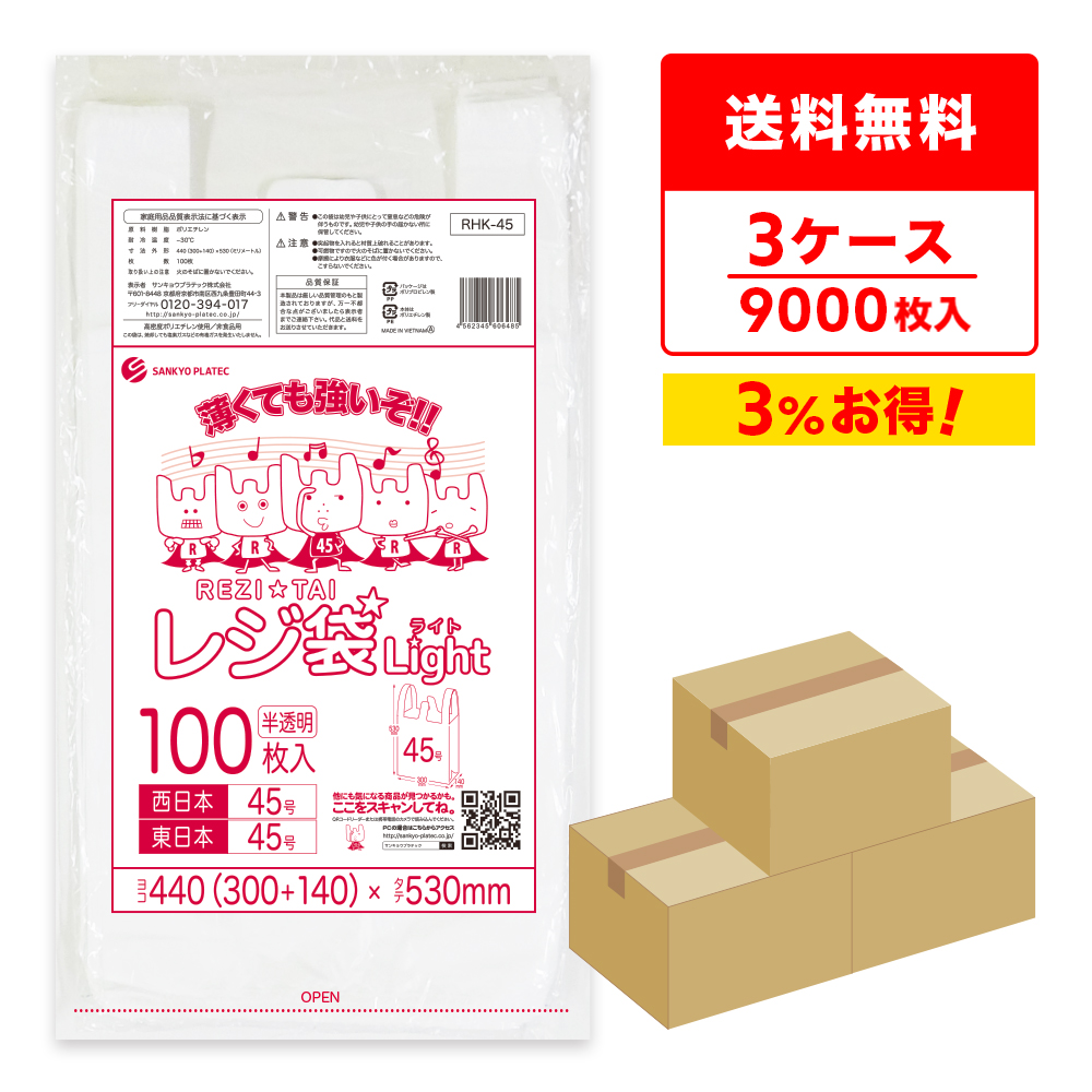 レジ袋 薄手 西日本 45号 (東日本45号) ブロック有 30x53cm マチ14cm 0.016mm厚 半透明 100枚x30冊x3箱 RHK-45-3 サンキョウプラテック
