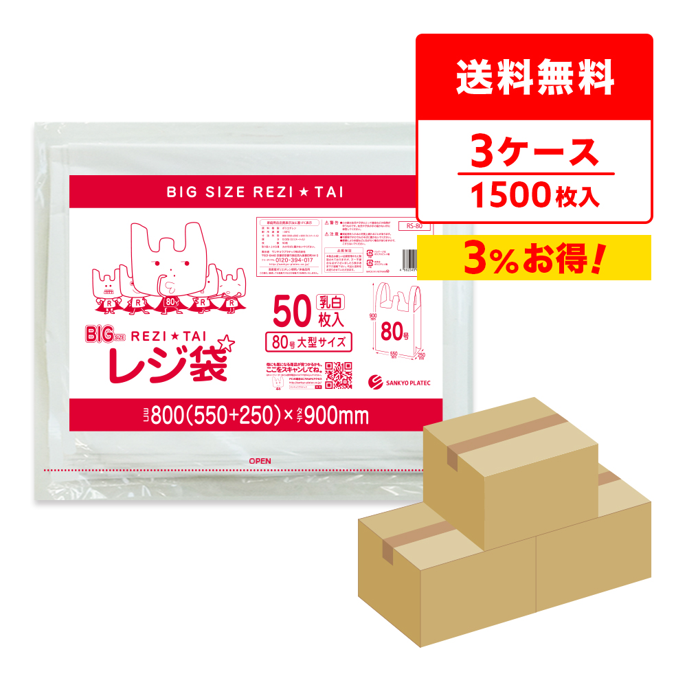 レジ袋 厚手 西日本 80号 大型 ブロック有 55x90cm マチ25cm 0.025mm厚 乳白 50枚x10冊x3箱 RS-80 サンキョウプラテック