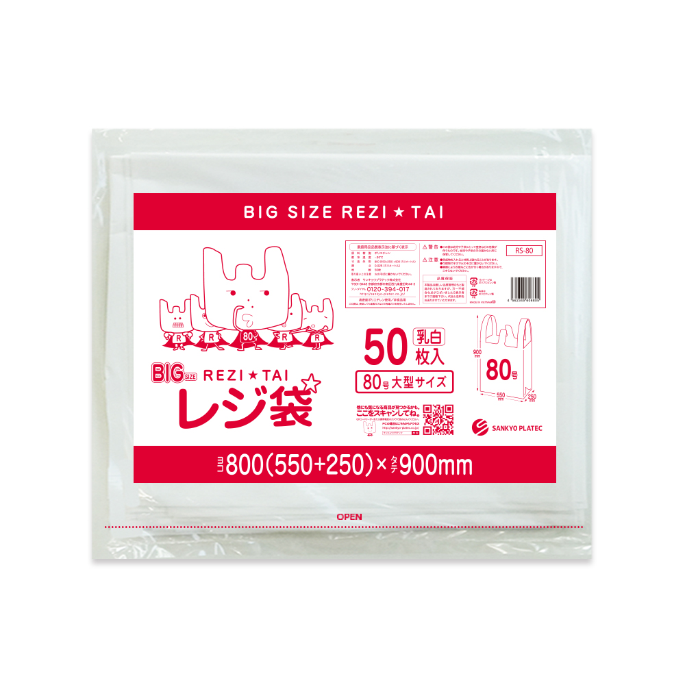 レジ袋 厚手 西日本 80号 大型 ブロック有 55x90cm マチ25cm 0.025mm厚 乳白 50枚 RS-80bara サンキョウプラテック