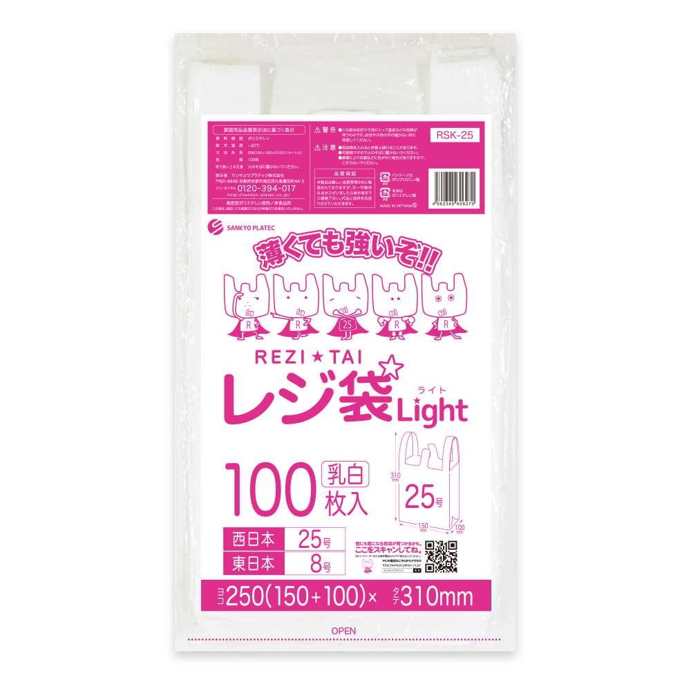 レジ袋 薄手 西日本 25号 (東日本8号) ブロック有 15x31cm マチ10cm 0.011mm厚 乳白 100枚 RSK-25bara サンキョウプラテック