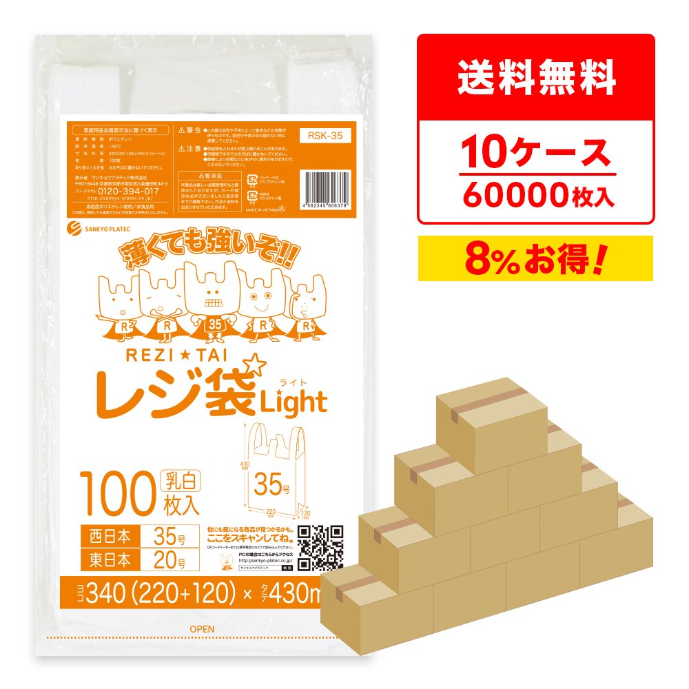 レジ袋 薄手 西日本 35号 (東日本20号) ブロック有 22x43cm マチ12cm 0.011mm厚 乳白 100枚x60冊x10箱 RSK-35-10 サンキョウプラテック
