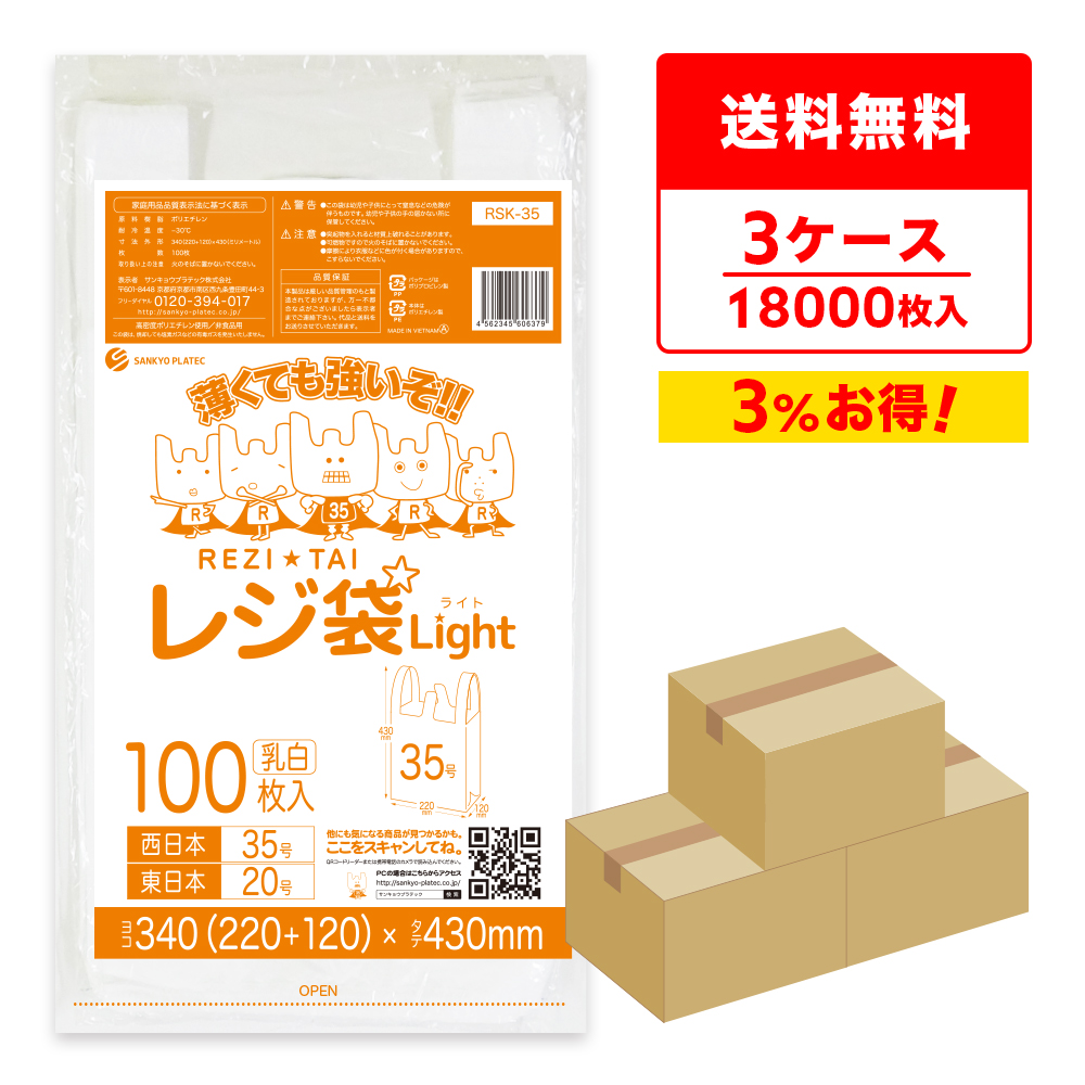 レジ袋 薄手 西日本 35号 (東日本20号) ブロック有 22x43cm マチ12cm 0.011mm厚 乳白 100枚x60冊x3箱 RSK-35-3 サンキョウプラテック