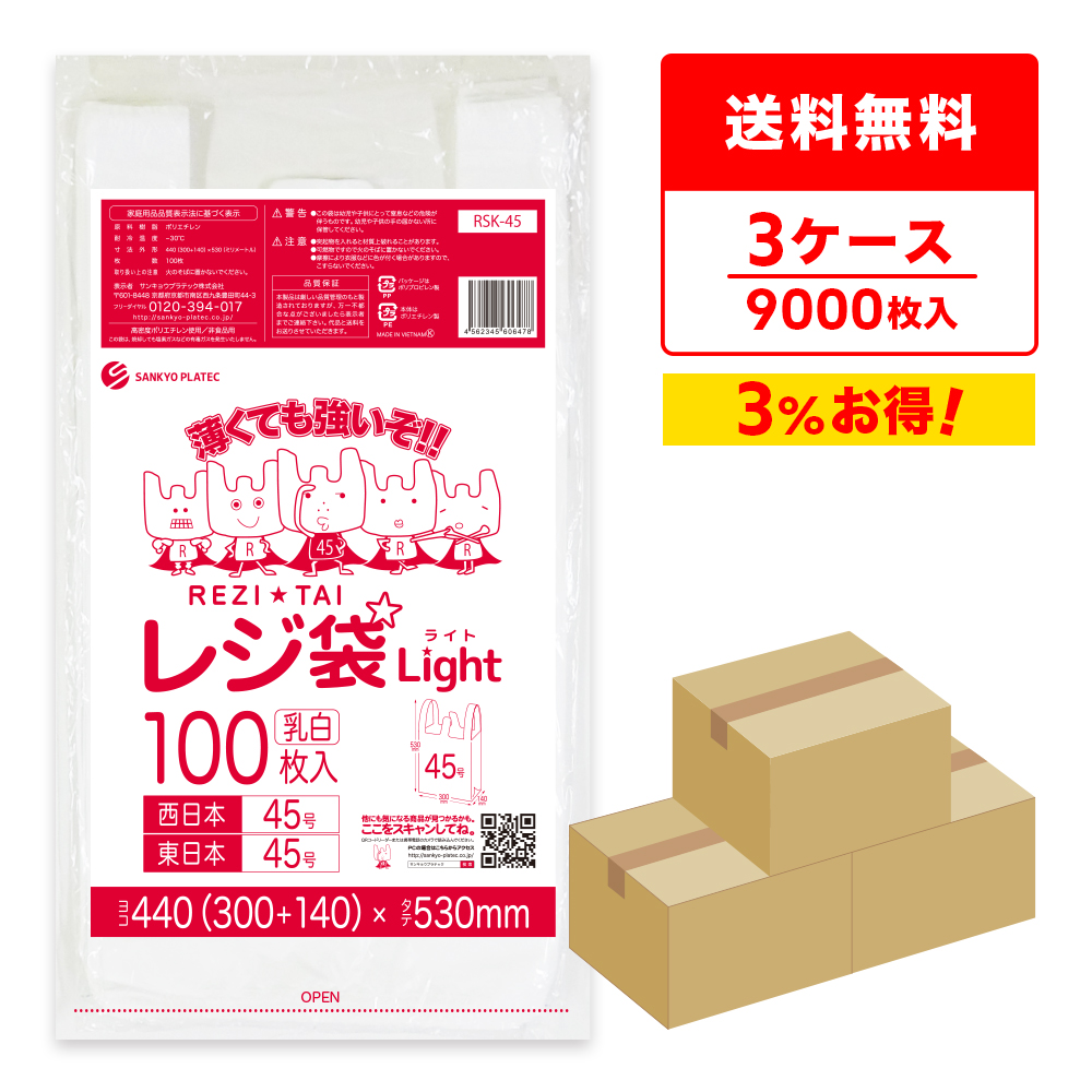レジ袋 薄手 西日本 45号 (東日本45号) ブロック有 30x53cm マチ14cm 0.016mm厚 乳白 100枚x30冊x3箱 RSK-45-3 サンキョウプラテック
