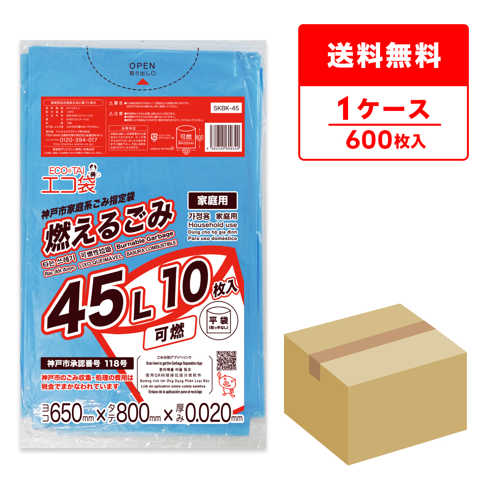 神戸市 家庭系 指定 ゴミ袋 燃えるごみ 45L 青 65x80cm 0.020mm厚 10枚x60冊 SKBK-45 サンキョウプラテック