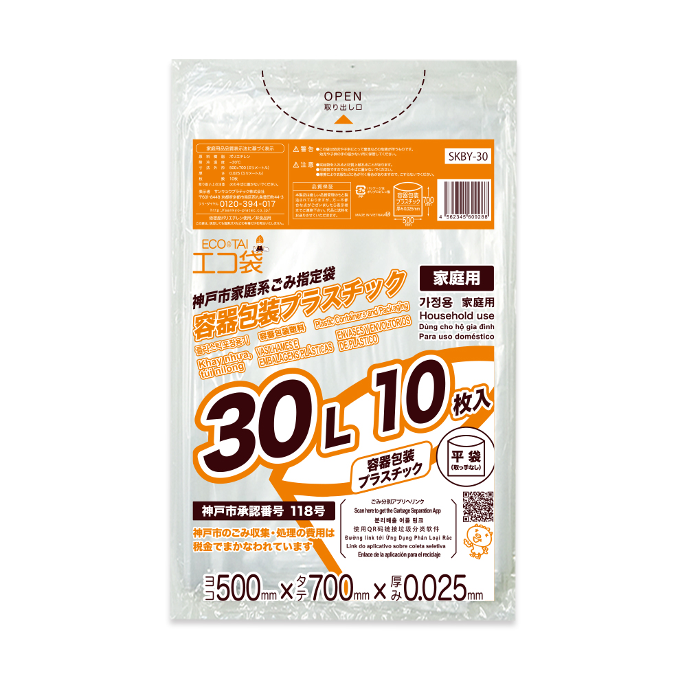 神戸市 家庭系 指定 ゴミ袋 容器包装プラスチック 30L 透明 50x70cm 0.025mm厚 10枚 SKBY-30bara サンキョウプラテック