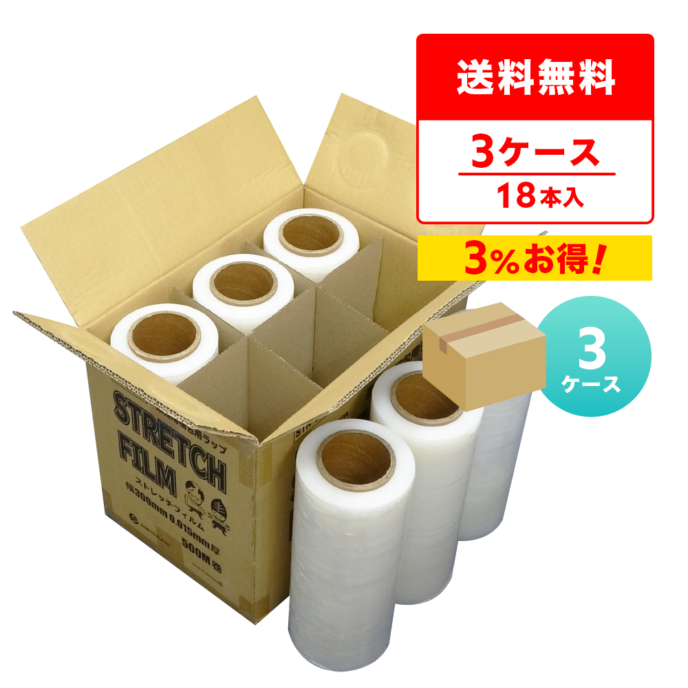 ストレッチフィルム 透明 300mm幅x500m 15μ 6本x3箱 STR-300-15-3 サンキョウプラテック
