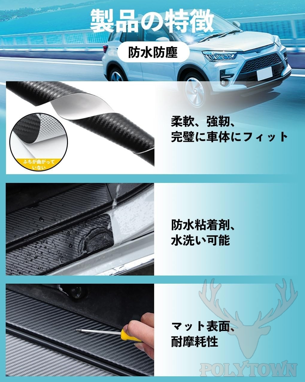 特徴1、高品質素材 カーボンファイバードアシル装飾ストリップはカーボンファイバービニール素材を採用し、強力な接着剤が使用されています。ちぎっても車体に粘着性の残留物が残らず、塗装面を損傷することはありません。