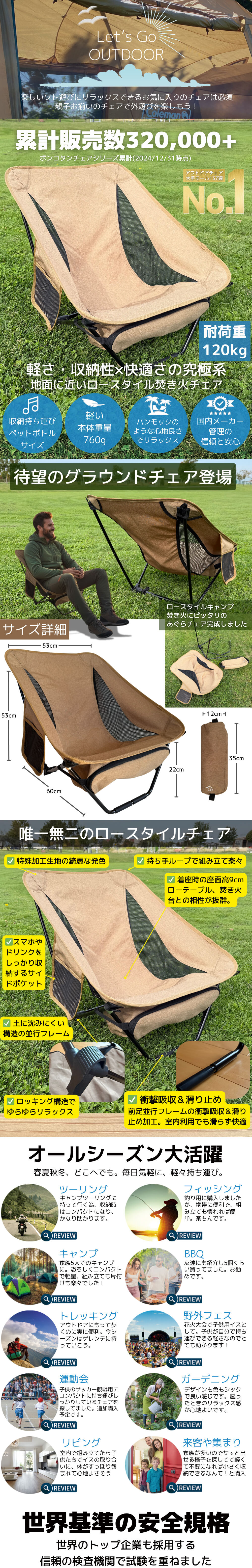 【 🎊おかげさまで累計販売32万台超えのロングセラー🎊 】▶ コンパクトチェア32万脚超えのベストセラー「PONCOTAN」。 ✅フレームは戦闘機等にも使用され、アルミ合金の中でも最高強度を誇る7075超々ジュラルミン製。指定提携工場にて、アルミニウムの品質を材料から徹底管理。日本国内、信頼の検査機関で安全試験を重ねました。 シート差し込み部の素材と縫製工程の見直しにより、強度・耐久性のUPにも成功。シート座面・フレーム・収納ケースまでも、より安心・快適な設計に改良済み。ロースタイルキャンプや焚き火にピッタリの低座面設計グラウンドタイプ。
