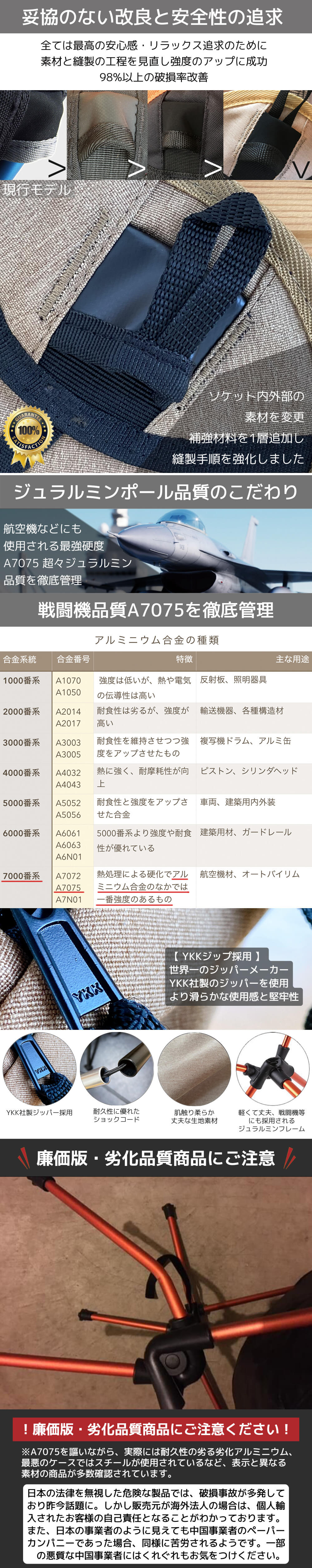 【 ❗❗廉価版・劣化品質版商品にご注意ください❗❗ 】現在アウトドアチェアの業界は、個人や海外業者の乱立により耐荷重・素材や仕様、安全性を偽った商品が溢れ、いわば"言った者勝ち"の無法地帯になっています。A7075を謳いながら、実際には耐久性の劣る劣化アルミニウム、最悪のケースではスチールが使用されているなど、異なる素材の商品も多数確認されています。永久保証を謳いながら国内に法人を持たないため、返品、交換、修理などの手続きが非常に難しい。または実際には保証を受けることが不可能なケースも散見されます。 ●当店は輸出入符号取得済み、国内PL保険加入済みの日本法人ですので、保証面でも安心していただくことができます。おかしな日本語の説明文やサクラレビューには十分ご注意ください。
