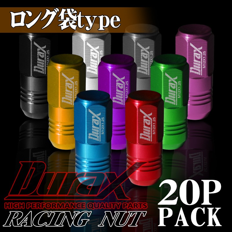 ホイールナット レーシングナット ロング袋 P1.5 P1.25 レッド ブルー ブラック ゴールド チタン シルバー 20個セット DURAX BBPLF