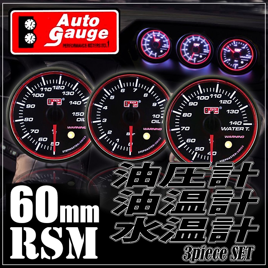 オートゲージ 水温計 油温計 油圧計 60Φ 3連メーター RSM 3点セット スイス製モーター エンジェルリング ワーニング スモークレンズ RSM60AUTOA3SET