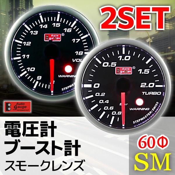 オートゲージ ブースト計 電圧計 60Φ 2連メーター SM 2点セット スイス製モーター スモークレンズ ワーニング機能 60mm SM60AUTOB2SET