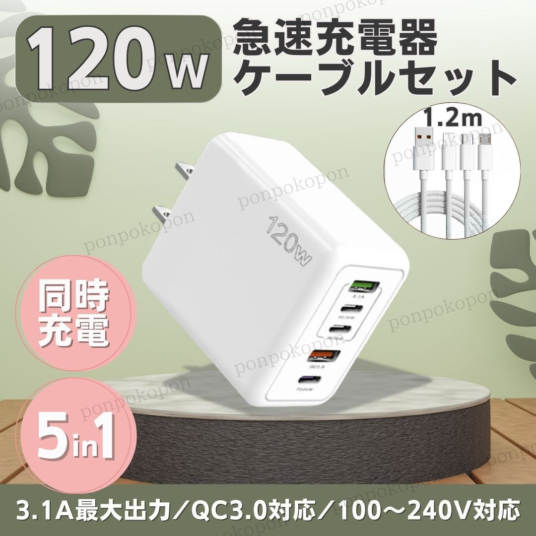 急速充電器 120W 6A セット PD タイプC 同時充電 高速 USB スマホ 携帯 iPhone iPad Android AC QC3.0 5ポート 充電ケーブル ライトニング