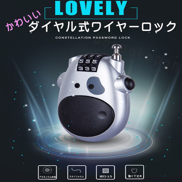 ワイヤーロック 牛 かわいい 鍵 巻き取り式 ダイヤル式 ダイヤルロック 3桁 セキュリティ カバン 盗難防止 携帯性抜群 小型 軽量
