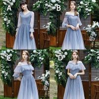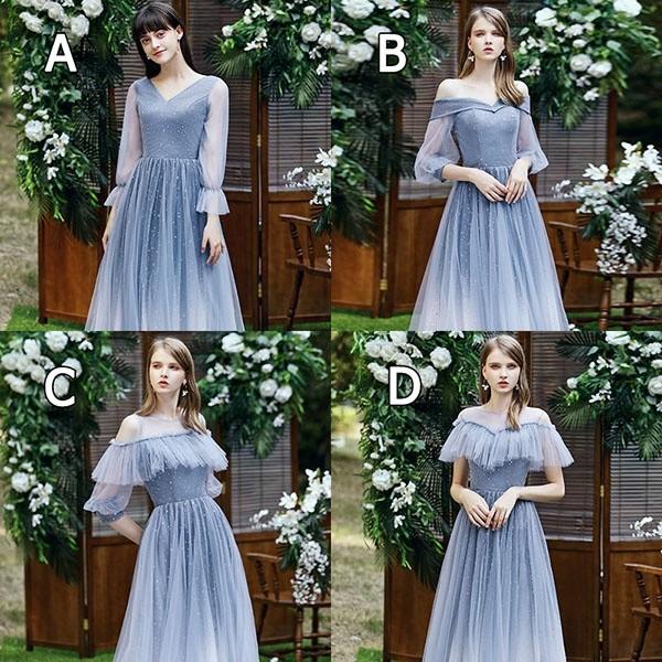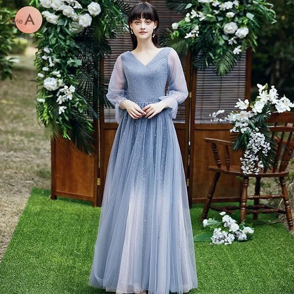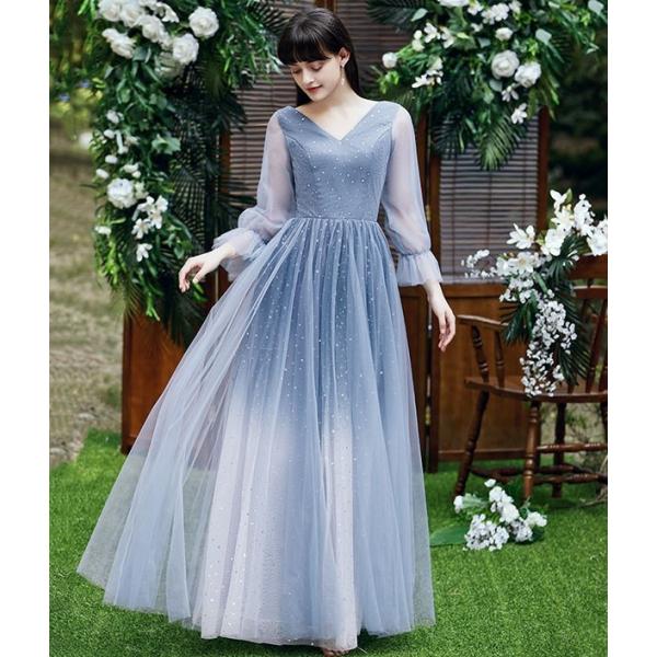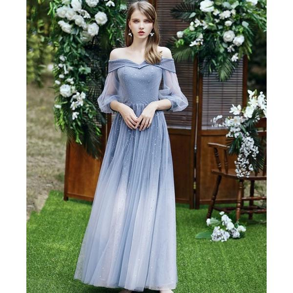 ブライズメイド ドレス ロング丈 二次会 4タイプ 袖あり Vネック 肩出し オフショルダー フリル パーティードレス レディース 小さいサイズ 大きいサイズ 締め上げ 大人 結婚式 フォーマル 花嫁 森ガール 成人式 演奏会 発表会 ブルーda124c7c7zb