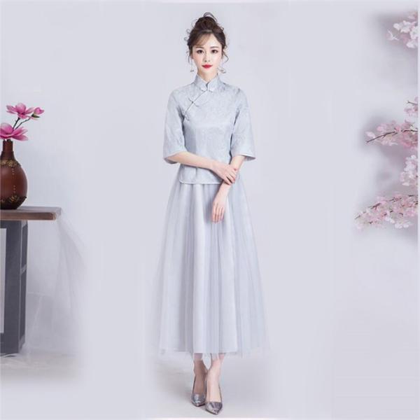 中国風 ブライズメイドドレス お揃いドレス ロングドレス ピンク グレー あずき トップス スカート 花嫁の介添えドレス 二次会 発表会