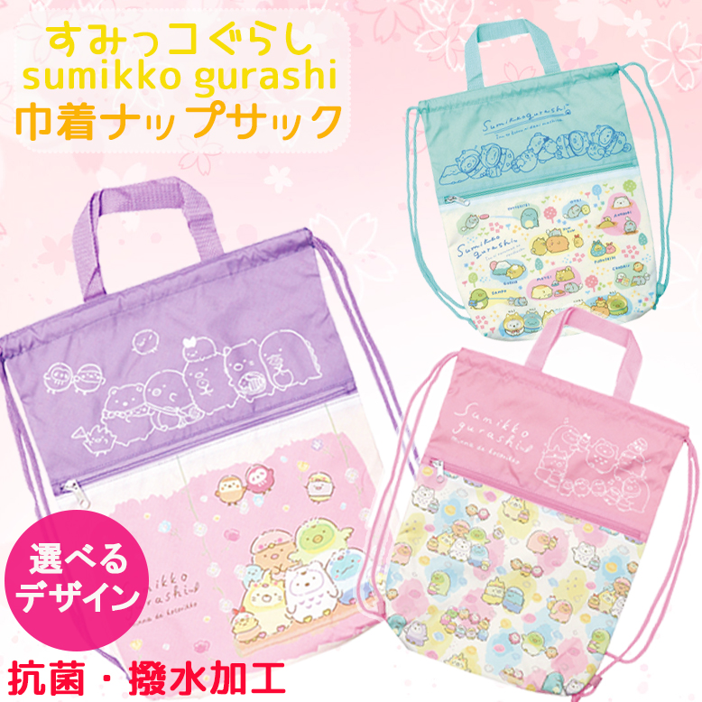 すみっコぐらし 【 選べるデザイン ・ 巾着 ナップサック 】外生地 抗菌加工 撥水加工 新入学 お祝い プレゼント 学校 お出かけ キャラクター キッズ ガールズ