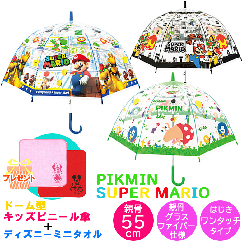 キャラクター ドーム型 ビニール傘 マリオ ピクミン 親骨 55cm[ 対象身長 130cm〜] 骨数 8本 親骨 グラスファイバー 【 ミニタオル 付】