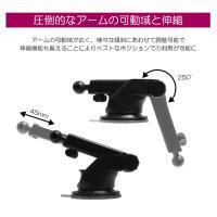 安価なゴム吸盤ではなく、ゲル状の吸盤と2段ロックでしっかり固定!可動域が広く伸縮するアームにボールジョイント式でダッシュボードやガラスなど好きな位置にホルダーを設置!付属パーツでエアコン吹き出し口にも取付可能です!