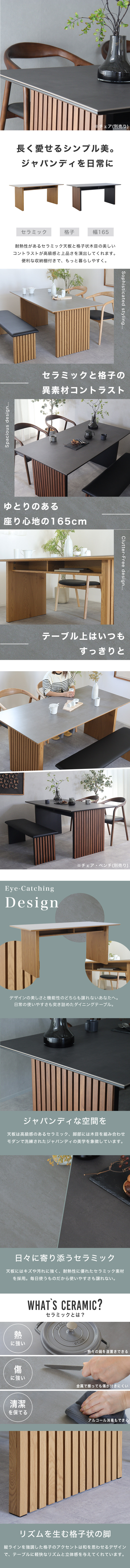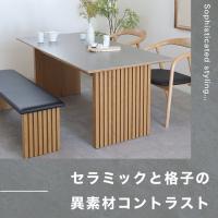 耐熱・耐水が魅力のセラミック素材と和の雰囲気を醸し出す木格子を組み合わせた和モダンテイストのダイニングテーブル。4人がゆったり食事をとれるサイズ感。洗練された上品な食卓空間に仕上げてくれます。天板下には収納棚を設け、デザイン性だけではなく使いやすさにもこだわっています。