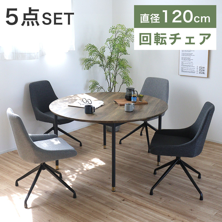 【5点セット】 ダイニングテーブルセット 4人掛け ダイニングチェア 丸テーブル 円形 120 おしゃれ 布地 回転チェア ヴィンテージ 高級感 グレー
