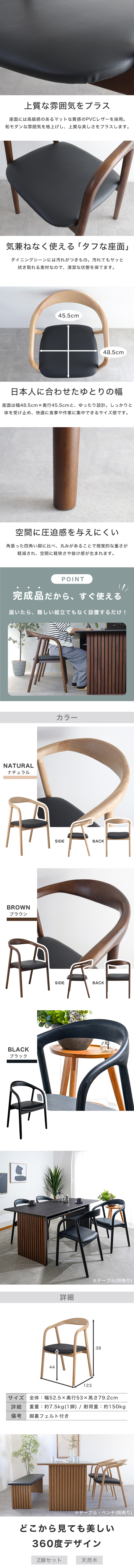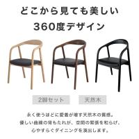 背もたれの優しい曲線が美しいダイニングチェア2脚セット。曲線は住宅空間での緊張緩和の効果もあり、ダイニングに優しい印象を与えてくれます。座面はPVCレザーを使用しクッション性を高めています。長時間座っても疲れにくく、快適にお過ごしいただけます。完成品なので、届いたら難しい組立てもなく、設置するだけでその日のうちにご使用いただけます。カラーはナチュラル、ブラウン、ブラックの3色展開で、お部屋の雰囲気に合う色味を選べます。