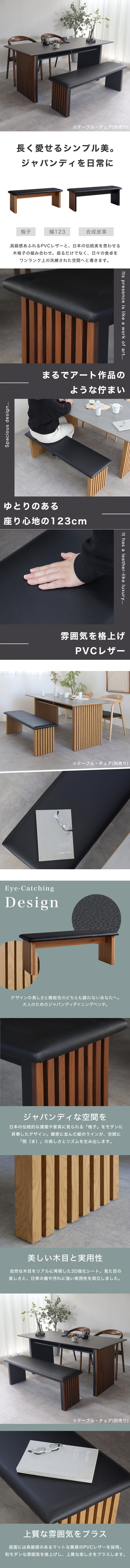 高級モダンな雰囲気のPVCレザーと和の風格を醸し出す木格子を組み合わせた和モダン・ジャパンディテイストのダイニングベンチ。2人がゆったり座れるサイズ感。洗練された上品な食卓空間に仕上げてくれます。