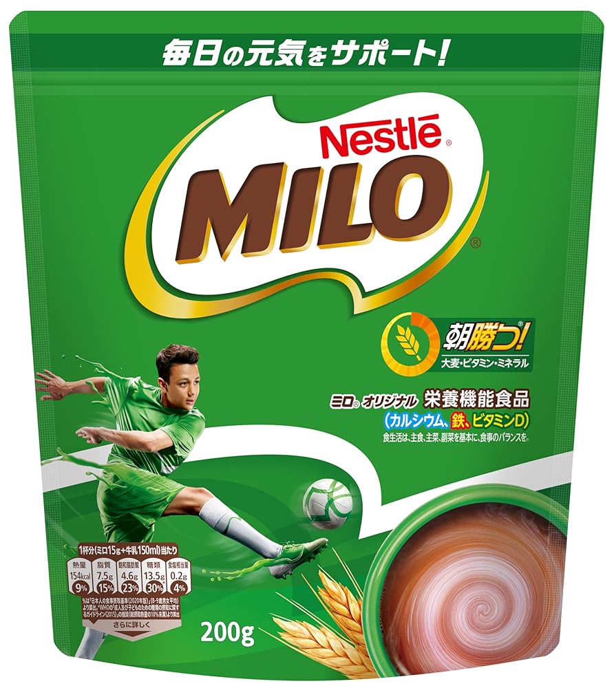 | 商品の説明 | 商品紹介 ミロは、大麦の発芽のための成長力を取り込んだ、豊富な栄養とおいしさを兼ね備えた大地の恵みの大麦飲料です。ミロの大麦エキスはエネルギーの源であるブドウ糖が様々な長さにつながったものが主成分。しかもミロにはカラダに必要な2種類のミネラル(カルシウム、鉄)、6種類のビタミン(ビタミンB2/B6/B12/D/C・ナイアシン)がしっかり。大麦飲料ミロは、いちにちを元気にはじめるエネルギーと栄養バランスを考えています 原材料・成分 混合大麦エキス(大麦、でん粉)、砂糖、ココアパウダー、脱脂粉乳、植物油脂、乳清カルシウム/リン酸カルシウム、炭酸カルシウム、ビタミンC、pH調整剤、ピロリン酸鉄、レシチン(大豆由来)、ナイアシン、ビタミンB6、ビタミンB2、酸化防止剤(ビタミンE)、ビタミンD、ビタミンB12 使用方法 1. 大さじ2(15g)のミロを入れます。2. お好みの温かい又は冷たい牛乳や水を注ぎます。3. よく混ぜてお召し上がりください。 安全警告 この商品には大豆と乳製品を含みます。注意してご使用ください。準備方法:大さじ2(15g)のミロを入れ、お好みの温かい又は冷たい牛乳や水を注ぎ、よく混ぜてお召し上がりください。保存方法:高温多湿のところおよび冷蔵庫での保存は避けてください。 |