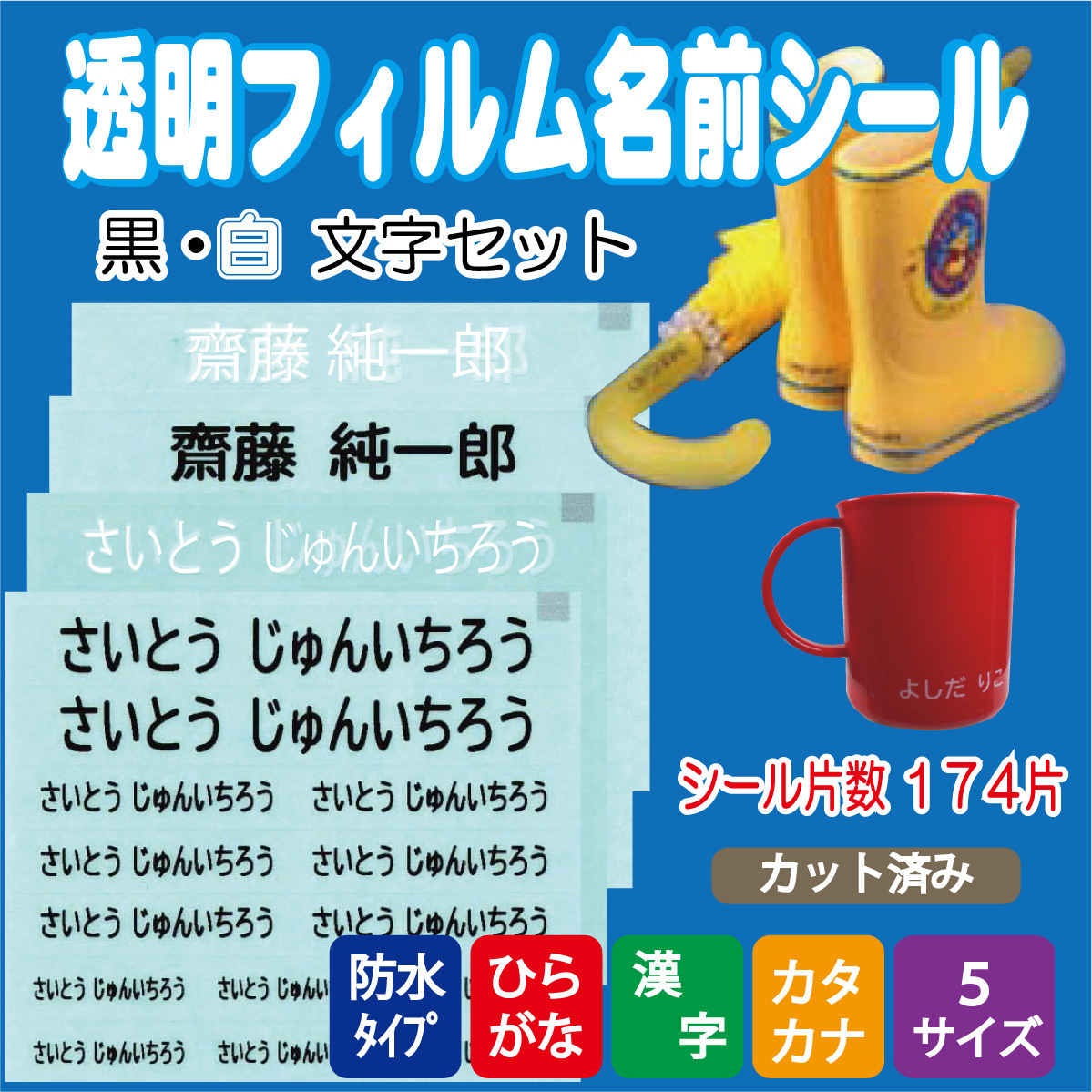 透明フィルム 名前シール【 黒・白文字セット 】 教材 介護 用品 名前付け シンプル 防水 おなまえシール 全シール174片