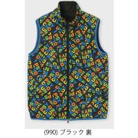 表にはシンプルな撥水加工の生地、裏にはチケットを組み合わせた総柄プリント生地を使ったリバーシブルベストです。