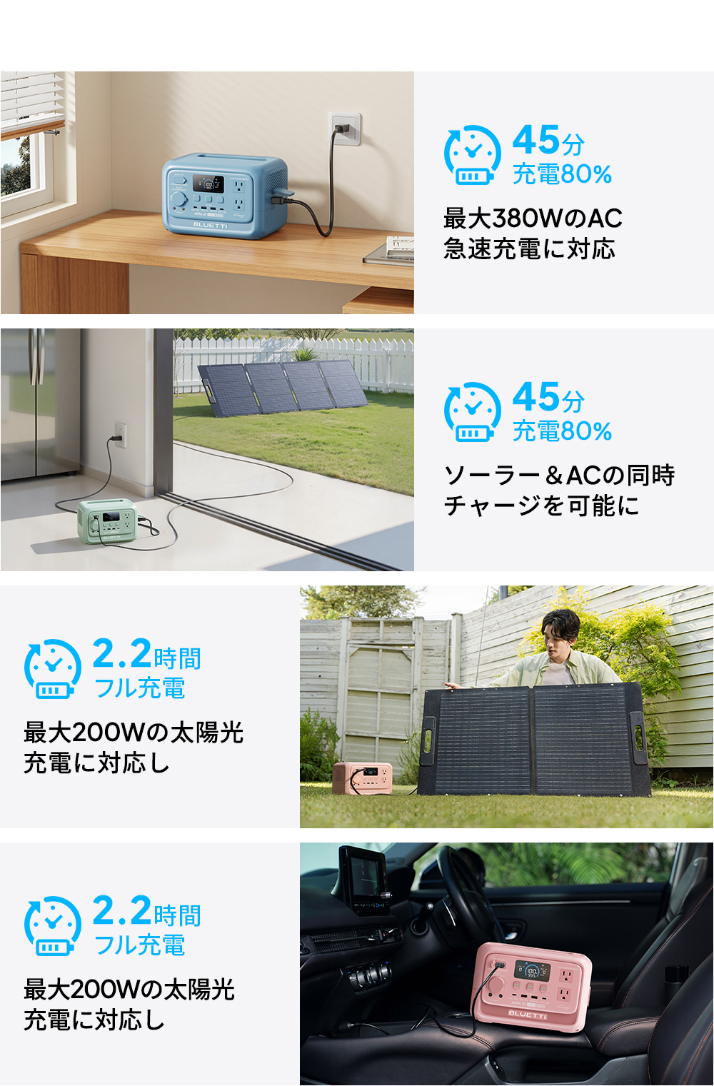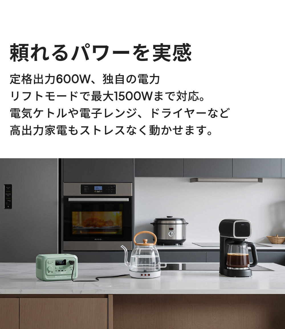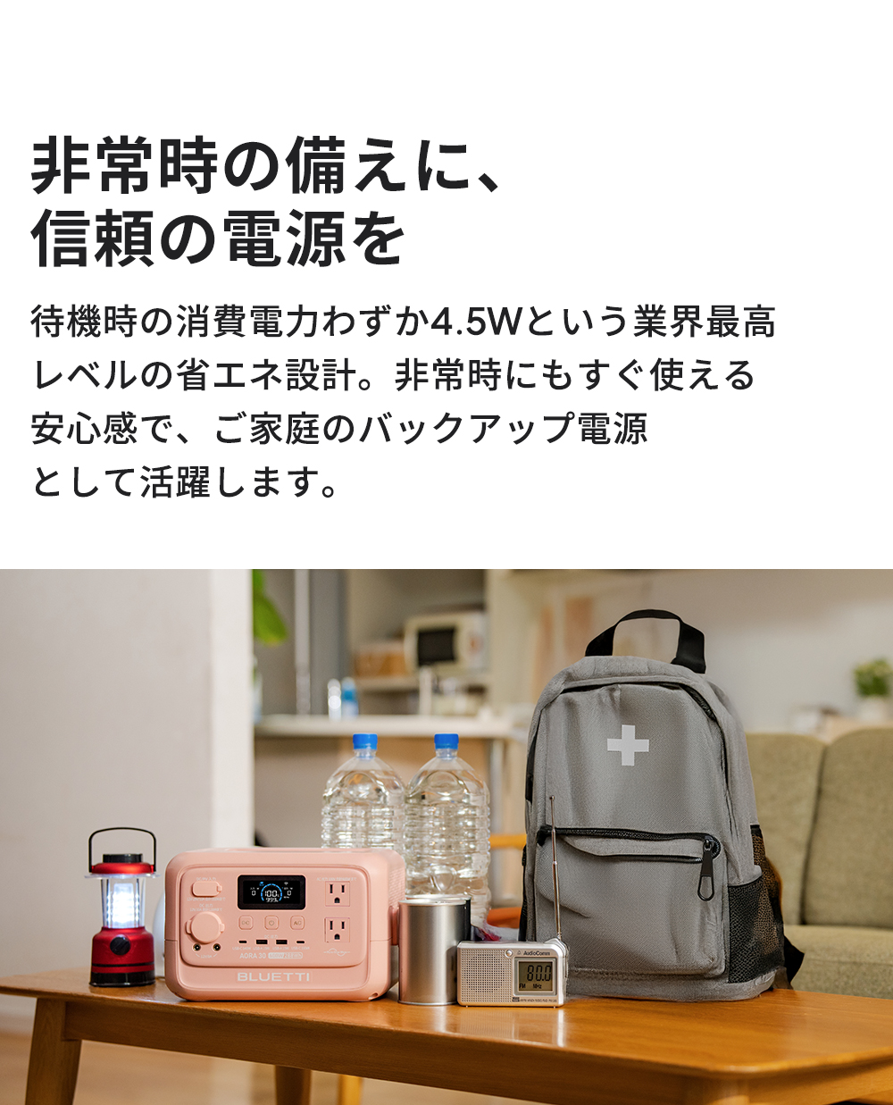 【日本専用設計|直感的操作と高安全性】 BLUETTI AORA 30 V2 は日本市場専用に開発されたポータブル電源。画面表示・操作ボタン・取扱説明書の日本語対応で、誰でも簡単操作。防災グッズとして屋内保管する場合も、アウトドアでの使用時も、機能美と実用性を兼ね備えています。筐体はUL94V-0認証の難燃材を使用し、過充電・過熱をリアルタイム監視するBLUETOPUS BMS(バッテリー管理システム)で、家族の安全を守ります。 【軽くてパワフル】 本体はわずか4.3kgの超軽量設計、女性や高齢の方でも片手でラクに持ち運べます。一体型グリップハンドルにより、車のトランクやテント内の狭いスペースにもすっきり収納でき、防災時の迅速な移動やキャンプ・車中泊での利便性を両立。定格600Wに加え、最大1500Wの電力リフトモードを搭載し、スマホやノートPCはもちろん、トースターや電気ケトルなどの家電にも幅広く対応します。 【10ミリ秒超高速UPS|防災にも安心】 UPS機能を搭載しており、停電時も約10ミリ秒で電力を瞬時に切り替えます。Wi-Fiルーターやパソコンなど重要機器を途切れさせずに守ります。最大980Wのバイパス給電に対応し、市電が正常な場合は機器に直接給電、非常時にはUPSが自動でバックアップを開始。防災対策はもちろん、テレワークなど日常の電源としても安心して使用できます。 【省エネ&急速充電|静音設計で快適に使える】 AORA 30 V2は、ACコンセント・ソーラーパネル・車の走行充電など8通りの充電方式に対応。AC入力最大380Wで、約45分で0〜80%まで急速充電が可能です。独自のUltraCell技術によりシステム全体の消費電力を最大50%削減。待機時の消費電力はわずか4.5Wで、省エネ性能にも優れています。さらに、PD 3.1対応USB-C(140W)を含む9つの出力ポートを搭載し、パススルーにも対応。約30dBの静音設計で、屋外でも在宅ワーク中でも快適に使用できます。 【業界高水準の5年保証】 AORA 30 V2はご注文日より業界注目の5年のサポート(保証)が付いております。環境面では、コバルトフリーの高い安全性リン酸鉄リチウムバッテリー(LiFePO4)を採用し、充放電サイクル3000回後も残存量は80%以上を維持します。1日1回使用でも10年以上の寿命があり、廃棄物削減に貢献します。BLUE LIFE環境理念に基づき、日本国内ではBLUETTI製品の無料回収プログラムを実施し、分解された部品の95%以上を再資源化。お客様の製品ニーズに応えるだけでなく、地球環境保護にも積極的に貢献します。 ※Yahoo!ショッピングにおけるBLUETTI製品の正規直販サイトは、BLUETTI(https://shopping.geocities.jp/poweroak/)のみです。他のショップ及び転売者様よりご購入された場合は、BLUETTI保証サービスの適用は除外されますので、予めご了承願います。 ※製品の改良・改善等のため、予告なく製品仕様が変更される場合がありますので、予めご了承願います。 |
