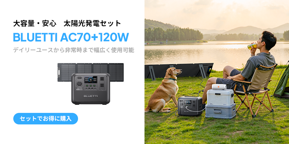 【1.5時間フル充電】 BLUETTI AC70は768Whのリン酸鉄リチウム電池を採用され、3000+充放電回数の長寿命と熱安定性を確保しながら、1000Wの双方向インバーターを装備しています。出力を高めるだけでなく、重いアダプターを持ち運ぶ必要がなく、AC充電ケーブル1本でBLUETTI Turbo技術で45分で80%まで充電、1.5時間フル充電が可能です。AC充電は3つのモードをアプリで選択でき、静音モードでは45dBという低騒音で、夜にも安心して静かに充電できます。 【電力リフトとUPS機能付き】 電力リフト機能により、電気ポットやドライヤーなど定格消費電力2000W以下の電熱線(電阻)搭載の家電でも使用可能です。AC出力ポート × 2(50Hz/60Hz)、USB-A × 2、USB-C × 2(100W)、シガーソケット出力を含む7つの出力ポートを備えています。AC70は20msの切り替え時間で瞬時に電力を回復するUPS機能を搭載してます。電力が遮断されたり、安全レベルを超える変動があったりした場合、AC70は瞬時にバックアップ電源を供給しますので、パソコン部品の破損、電子データの紛失、停電の心配がありません。 【最大500Wソーラー充電】 業界同じ容量帯の最大500Wの再生可能な太陽エネルギーにより、ポータブル電源AC70を1.9 - 2.4時間でフル充電できます。環境に優しく、電気料金を節約するだけでなく、停電時にも安心して電力を利用できます。また、AC70では最大950WのAC+DCデュアルチャージ(充電)が可能で、急いで外出する場合でも余裕を持って対応できます。 【APPコントロール】 スマホのBluetoothを通じてBLUETTIアプリを使えば、AC70の状態を監視し、充放電などのを設定し、バージョンアップをすることができます。スマートな管理が簡単に実現できます。デフォルトでは、ECOモードは電力を節約するために低出力電力が4時間続くと自動的にオフになります。 ただし、アプリで自動オフ時間やAC/DC電源設定を調整することができます。 【動作時間の延長】 B80/B230/B300でさらにパワーアップします。AC70は、B80/B230/B300拡張バッテリーの充電に対応しています(パワーバンクモード)。休日や旅行、車中泊での非常用電源として、またはアウトドアでの使用時間を延長するのに最適です。 【業界高水準の5年保証】 AC70はご注文日より5年のサポート(保証)が付いております。品質には万全を期しておりますが、万が一不良・破損・誤納品など、および正常使用による不具合の場合は、無料修理/交換の対象となります。ご購入後何かございましたら、迅速なご対応をさせていただきますので、ご遠慮無くお問い合わせください。 「付属品」AC70本体、ACアダプター充電器、MC4ソーラー充電ケーブル、カーチャージャケーブルと取扱説明書が付属します。 |