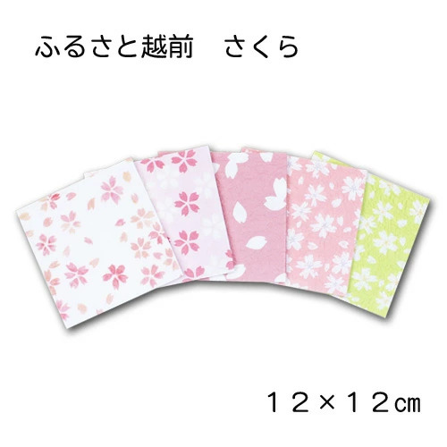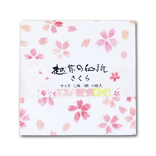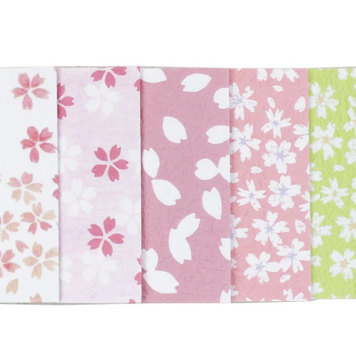 揉みと光沢を加えた薄手の越前和紙パックです。桜の柄が5柄、1柄10枚ずつ、計50枚入っています。