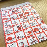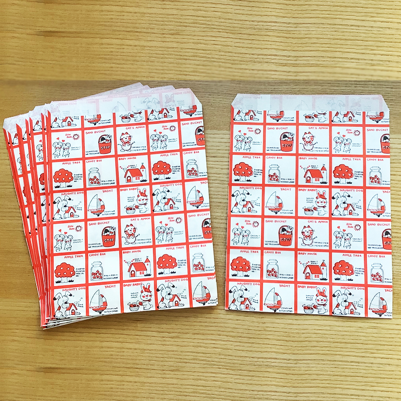 どこか懐かしさを感じるレトロなデザインで、手描きのイラストと文字を活かした何ともファンシーな紙袋です。ペンや小ぶりなノートが入るくらいの大きさです。