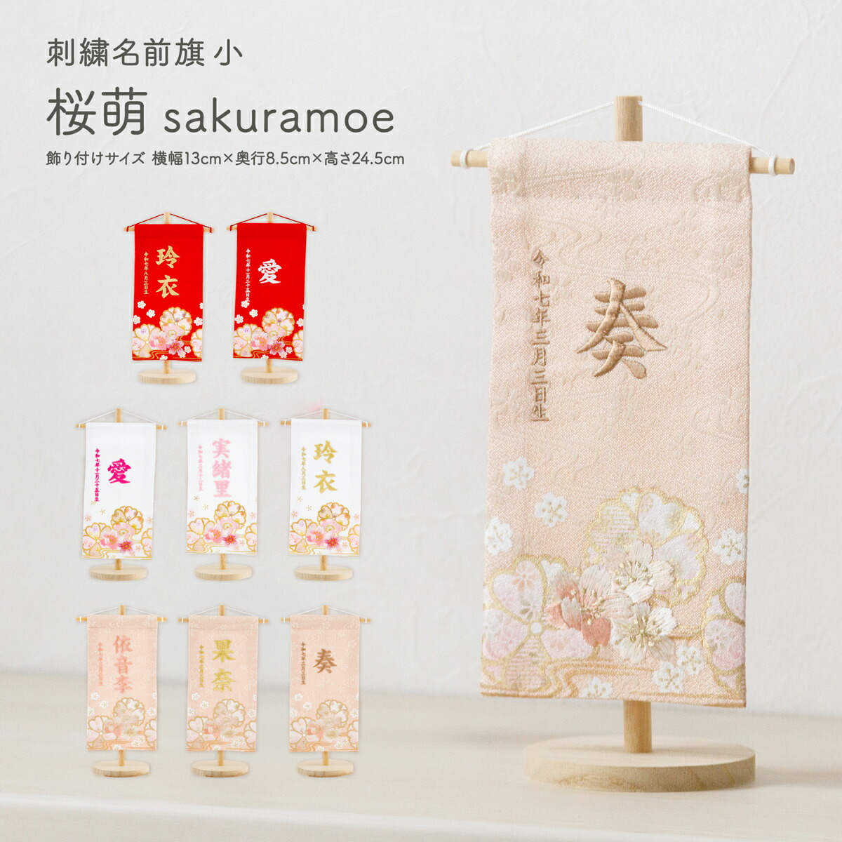女の子向けの刺繍名前旗。かわいい桜柄がお名前を彩ります。小さいひな飾りやひな人形にも合うコンパクトサイズなので、当店オリジナルブランド雛人形『小さなおひな様 ぷりふあ』とも相性抜群。インテリア小物のようにおしゃれに飾っていただけます。選べるデザインは8種類ご用意しました。