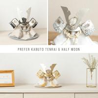 煌々とした輝きを放つコンパクトで美しいインテリア兜飾り。華やかな装飾はおめでたい端午の節句にもぴったりのデザイン。人気の金銀の兜は、力強さと高貴さを感じる絢爛豪華な節句飾りです。半月を連想させるようなロマンチックな飾り台は、お部屋や兜飾りに合わせて5種類から選べます。兜の色味や装飾を引き立てるシンプルモダンかつおしゃれなフォルムで、五月人形そのものの美しさを存分に楽しむことができます。