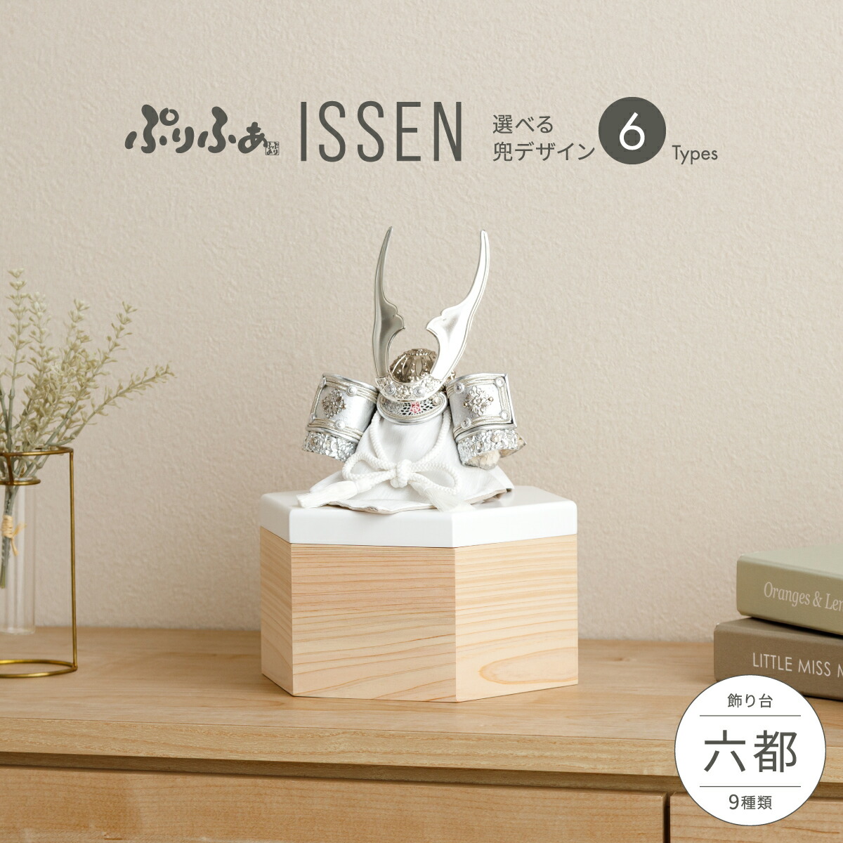 繊細な作りと華やかさを兼ね備えた重厚感のあるコンパクトな兜飾り。脇飾りはお部屋の雰囲気や兜に合わせてお選びください。古来より縁起がよいとされる六角形を表現したコンパクト飾り台は、兜を収納できるスペースが付いたボックスタイプ。カラーは、アリスブルー・スノーホワイト・マットブラックの3種類からお選びいただけます。