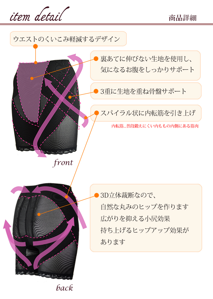 内転筋(太ももの内側の筋肉)にスパイラル状に巻き付くパワーのある生地を使用し、ギュっと引締めサポート。
