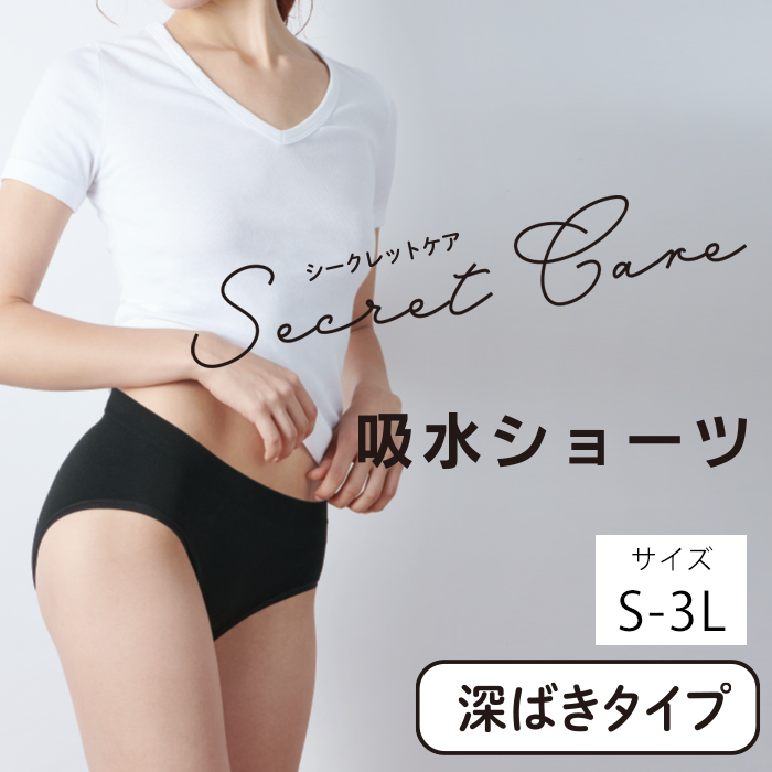 吸水ショーツ 深ばきタイプ 尿もれ 生理用 送料無料 シークレットケア サニタリー ブラック 黒 女性 消臭抗菌 吸水速乾 羽付きナプキン取付可 軽失禁パンツ 下着