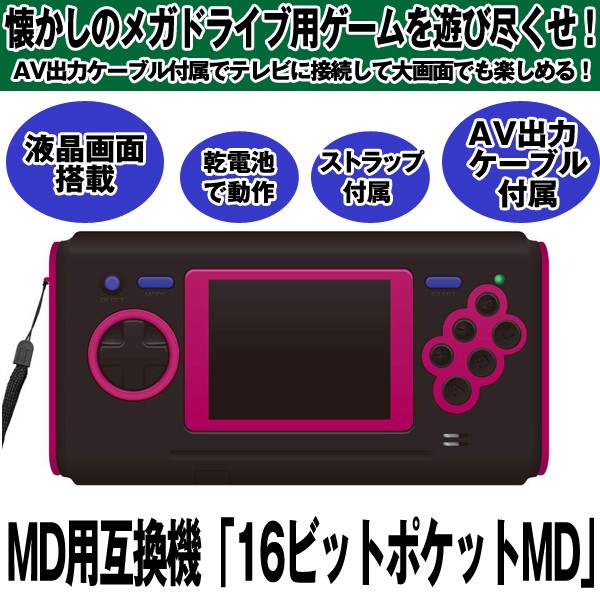 MD用互換機「16ビットポケットMD」(メガドライブ MD用ゲーム レトロゲーム 液晶画面付き 携帯ゲーム機 ストラップ付き AV出力ケーブル)