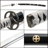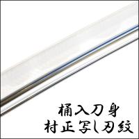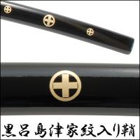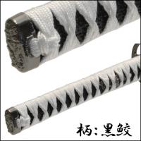 ■仕様 刀身 : 樋入刀身 村正写し刃紋、 鞘 : 黒呂島津家紋入り鞘 / 材質 : 朴の木、 柄 : 黒鮫 / 材質 : プラ製樹脂、 金具 : 合金、 鍔 : 九十透かし鍔、 縁・頭・目貫 : 龍の図、 柄糸 : 人絹 白糸、 下緒 : 人絹 白糸