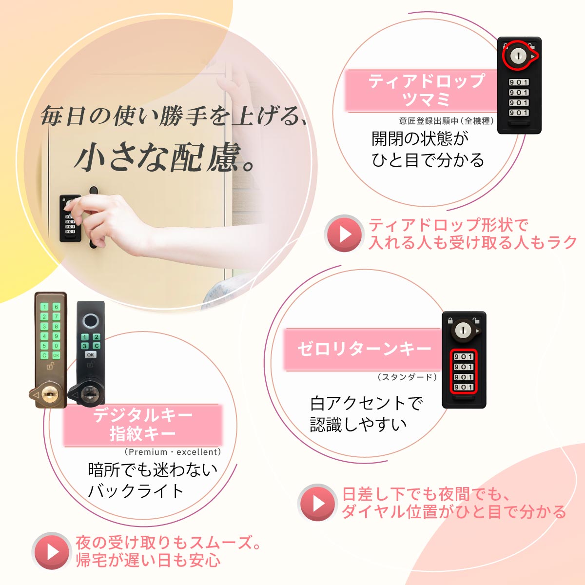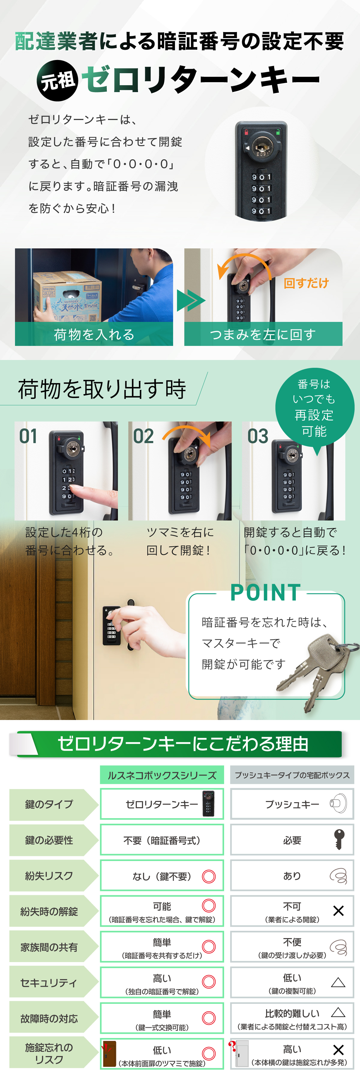 鍵を紛失したり複雑な操作がいらないゼロリターンキー。高品質・防水防塵のパウダーコーティング塗装。