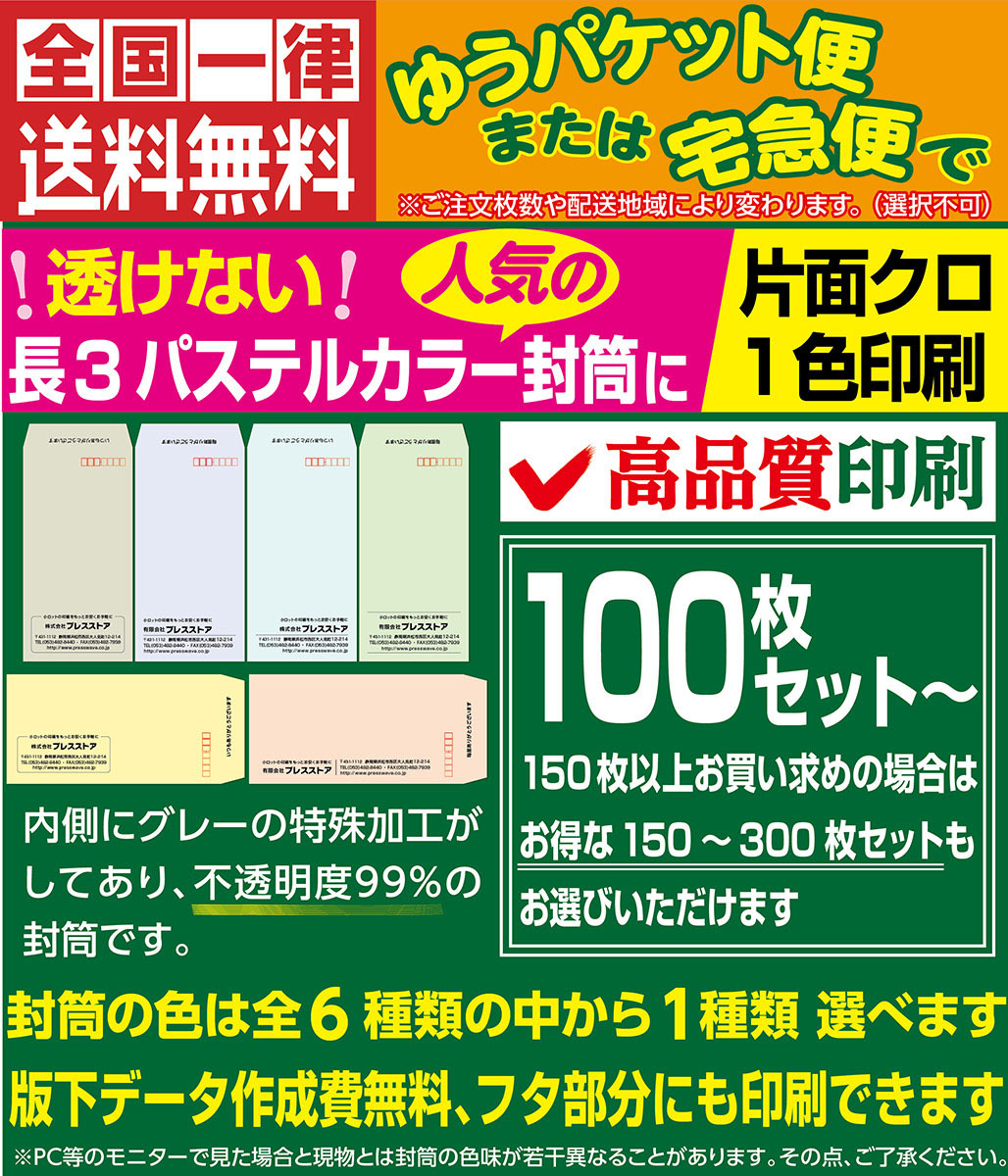封筒印刷 透けない長3パステルカラー封筒 黒1色 版下作成費無料 100枚セット〜