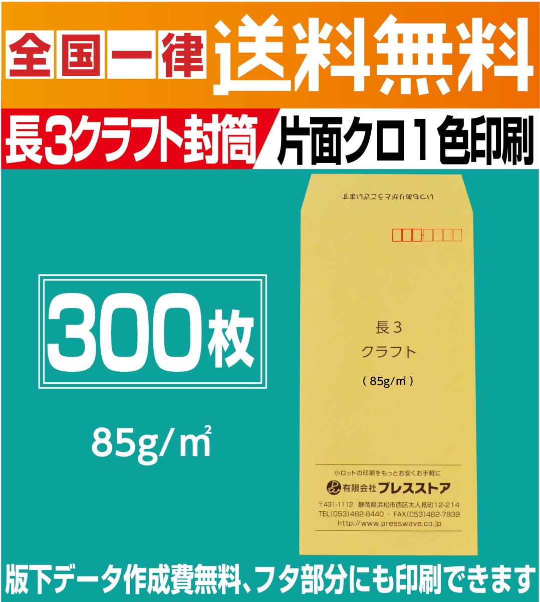 封筒印刷 長3クラフト封筒 黒1色 300枚 版下作成費無料 フタ部分にも印刷可