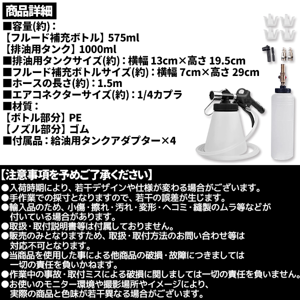 容量(約):フルード補充ボトル 575ml 排油用タンク1000ml