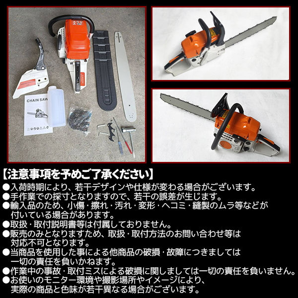 セット内容:本体×1 ソーチェーン×1 混合タンク×1 ガイドバー×1 ガイドバーカバー×1 工具一式×1