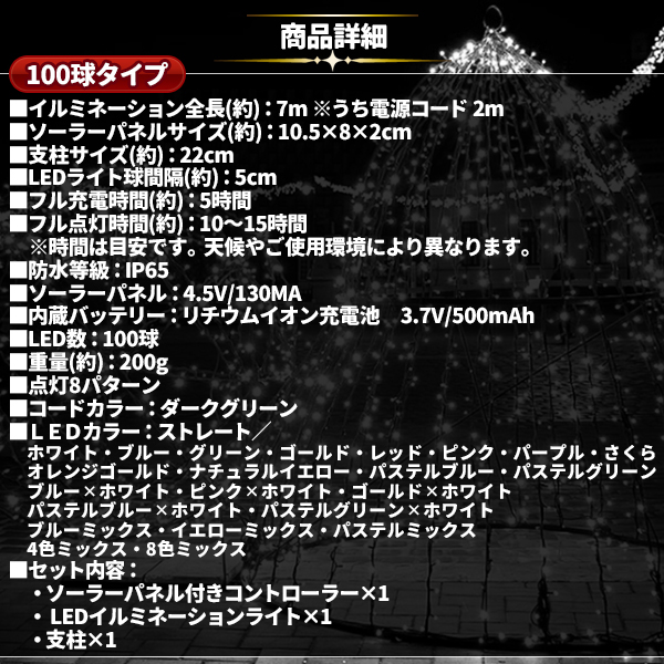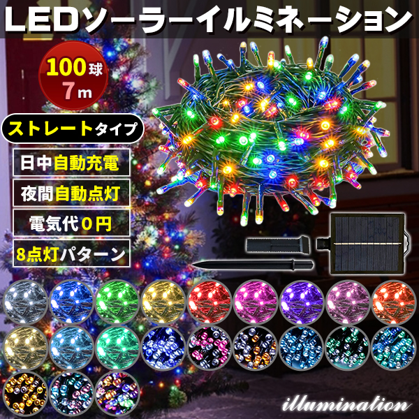 ソーラー イルミネーション 屋外 クリスマス ストレート 屋外用 イルミネーションライト 100球 各色